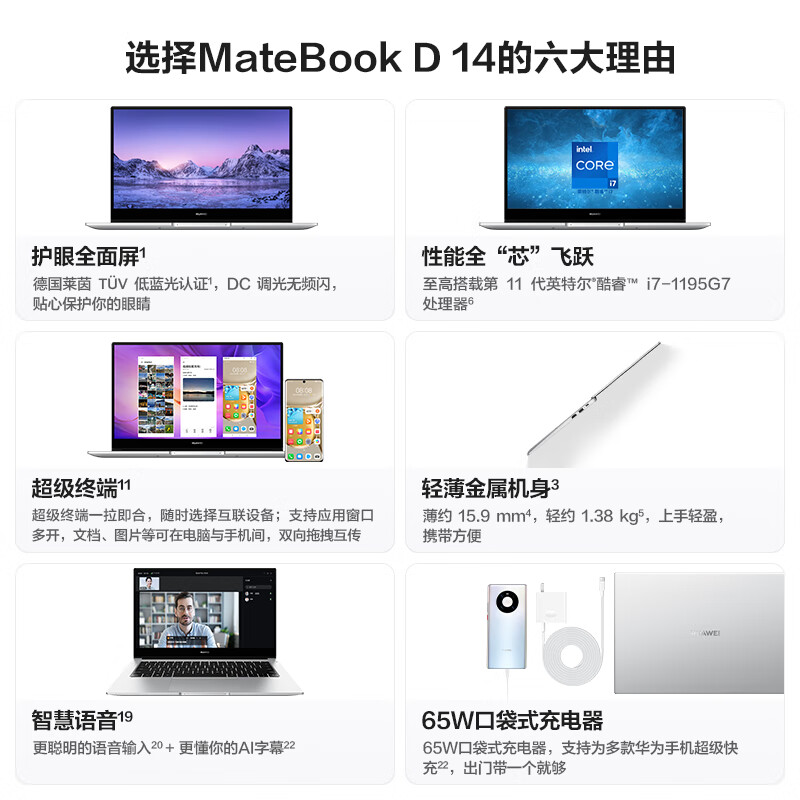 华为笔记本电脑MateBook D 14 2022款 14英寸 11代酷睿 i5 16G+512G 锐炬显卡 轻薄本/护眼全面屏 银 自营