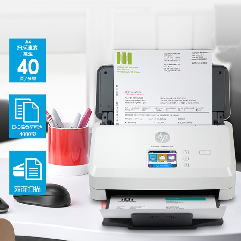 惠普(HP) 扫描仪2000s2/2600f1/4000snw A4高清馈纸式扫描仪批量高速双面扫描 4000snw1(U盘/有线无线/40张/80面) 自营